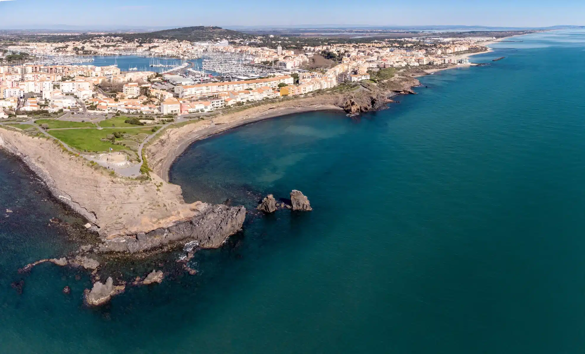 Destination phare de l’Hérault, le Cap d’Agde est une destination idéale pour des vacances en camping. Seulement 15 minutes en voiture et vous arrivez dans l’une des stations balnéaires les plus célèbres de la côte méditerranéenne. Plages de sable fin, parc d’attractions, patrimoine volcanique, activités nautiques : le programme tient plusieurs jours.